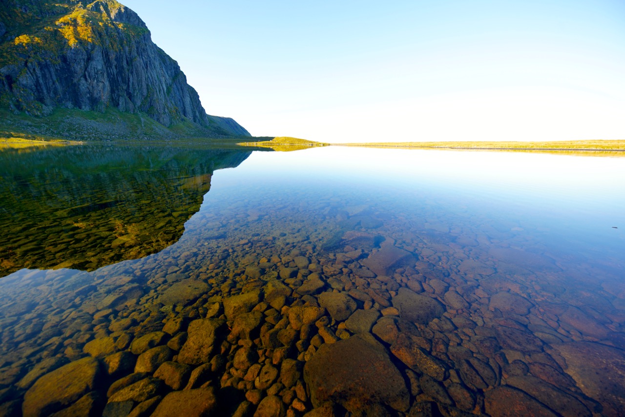 Die Themen Kunst & Kultur bekommen nicht nur in Henningsvær immer mehr Gewichtung, sondern sind durch verschiedenste Objekte und Installationen überall auf den Lofoten anzutreffen. Im folgenden Bild sieht man die gegenüberliegende Landschaft, welche sich im Hohlspiegel wiederspiegelt.