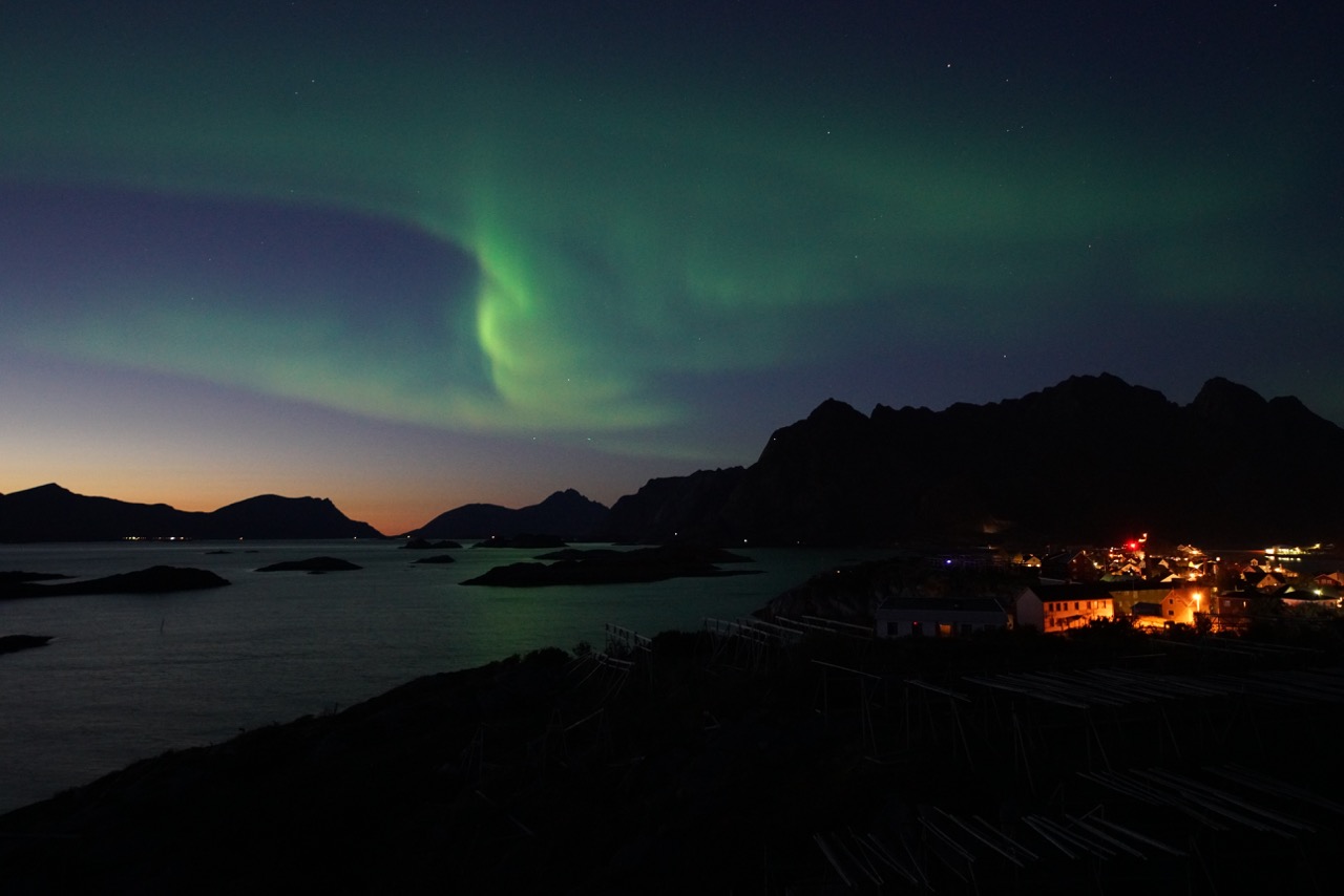 In Kabelvåg, gerade mal sechs Kilometer von Svolvær werden wir fündig. Gemütlich und direkt im geschützten Hafen gelegen beziehen wir ein kleines, über Airbnb angemietetes Häuschen. Endlich wieder mal Füße ausstrecken, eine heiße Dusche und genügen Steckdosen, um alle Geräte und Akkus zu laden. Auch der Spaziergang am Pier ist von Farben und toller Abendstimmung begleitet, während der Leuchtturm an jene nostalgische aber raue Zeit erinnert, wo sich ein hölzernes Fischerboot an das andere drängte. Was sich aber dann nach Einbruch der Dunkelheit am Himmel abgespielt hat, ist ein Naturschauspiel, welches unvergesslich und einmal erlebt, immer wieder eine Reise wert sein wird.