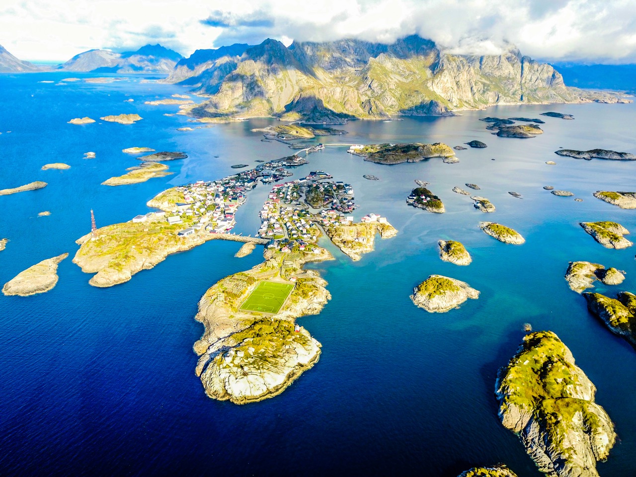 Erreichbar ist Henningsvær per Schiff oder über eine der zwei Brücken, die es mit Austvågøya verbinden. Aufgrund seines urtümlichen Fischerdorf-Charakters ist es ein beliebtes Touristenziel, aber auch beliebt bei Tauchern sowie Kletter- und Outdoor-Enthusiasten. Der Ort besitzt einen Kunstrasen-Fußballplatz, welcher, aus der Vogelperspektive und mit der Drohne aufgenommen, einfach sensationell aussieht. Die Bilder stammen aus 500 Metern Höhe und aufgrund des üblich starken Windes ist es einfach eine Geduld- und Wetterfrage, ob und wann man mit der Drohne aufsteigen kann. Es lohnt sich zu warten…