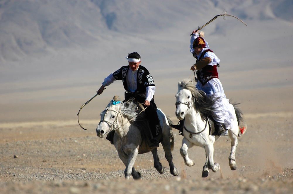 Vier Tage lang stellen die Nomaden ihre Adler zur Schau und lassen sie auf traditionelle Weise jagen, präsentieren ihre eigenen Bräuche, saufen sich die Hucke voll und messen sich in typisch männlichen Spielen. Wie sie mit ihren Pferden und Kamelen umgehen, ist schon erstaunlich und noch mehr, was sie alles damit machen können. Die Geschicklichkeit der Pferde wird bei den Reitwettbewerben zur Schau gestellt. Aber die absoluten Highlights sind jene Wettbewerbe, wo die Eagle Hunter ihren Adler auf die Spitze eines kleinen Berghügels setzen, dann wegreiten, um dann nach ca. 200 Meter Abstand den „Eagle Call“ zu machen. Jeder Eagle Hunter hat seinen eigenen individuellen Ruf, um seinen Adler zu rufen. Der Hunter hat eine schon getötete Beute an einem Seil befestigt, welches wiederum bis zu seinem Sattel führt. Bei einem Zeichen der Schiedsrichter (ausgewählte erfahrene Eagle Hunter) ruft der Hunter seinen Adler und von da an wird die Zeit gemessen, die der Adler braucht, um die am Seil befestigte Beute zu schlagen.