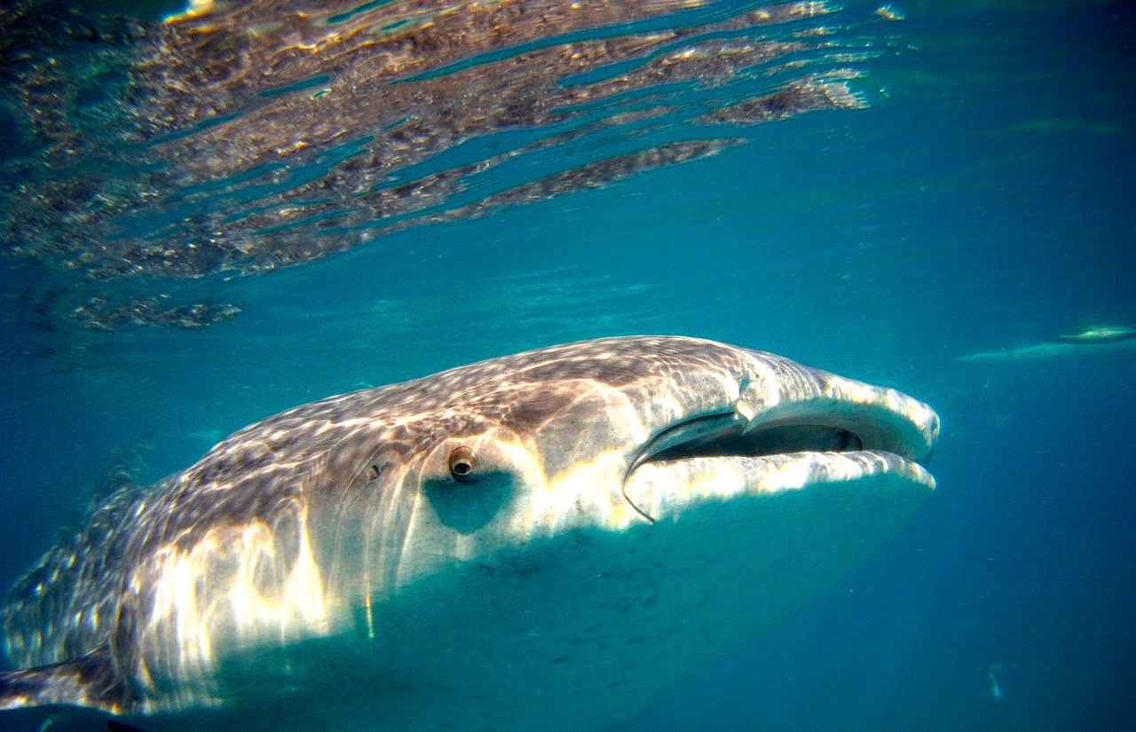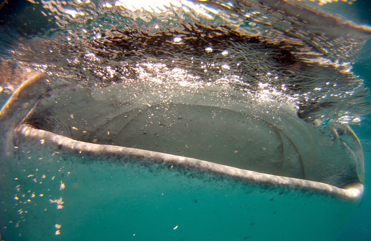 Um das Mundstück des Schnorchels benützen zu können muss man seine Klappe schon mal weit aufreissen, aber selbst der fällt, bei der ersten Begegnung mit einem Walhai, sprichwörtlich ins Wasser. Mit weit geöffneten Augen und Mund, der sich sogleich mit Salzwasser füllt, erstarre ich. Erstarre vor, ja vor was eigentlich ?