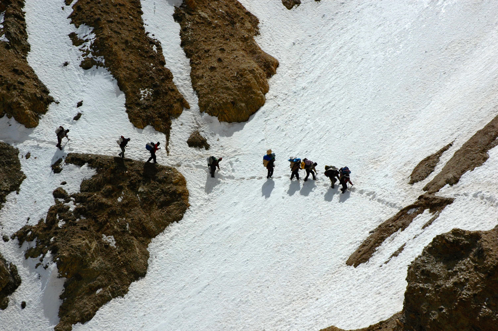 That route is a comfortable two-day climb, but not in every season, which was the reason why we had planned our ascent for early in the year: we had a visa for Tibet, but no permission to climb Gurla Mandate (7728 m). But if you are in the region in April, all roads from Lhasa to Kailash are drowned in the snow, which meant unrestricted movement because there would be no Chinese controls. In no time we crossed the pass and entered Tibet.