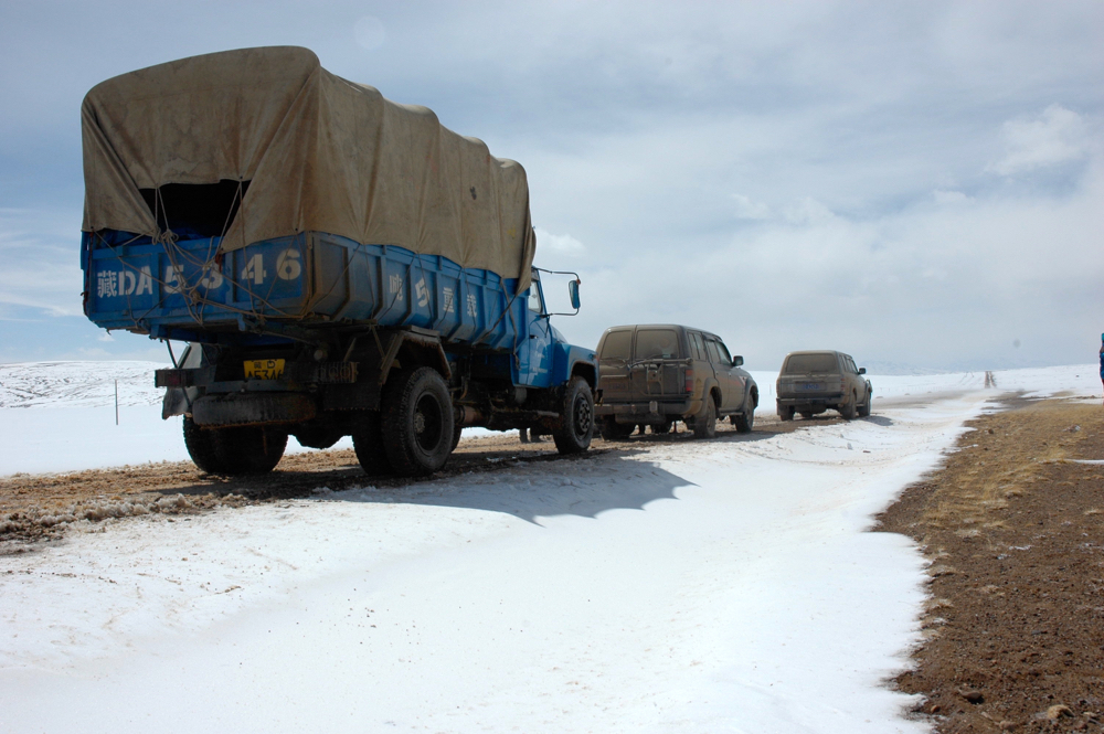Things worked out for once: after a week’s hiking from Hilsa, the two cars were waiting for us in Tibet. They were an all-terrain vehicle and a big truck, which held not only our equipment but also food and a few barrels of petrol. A good mix!
