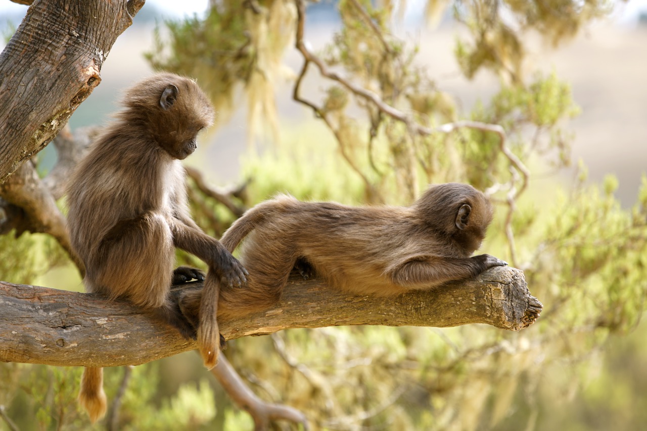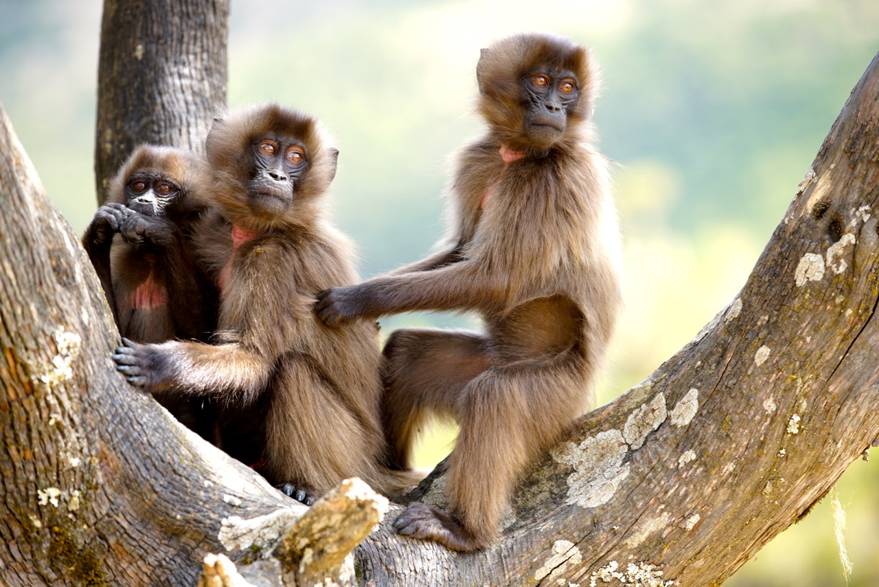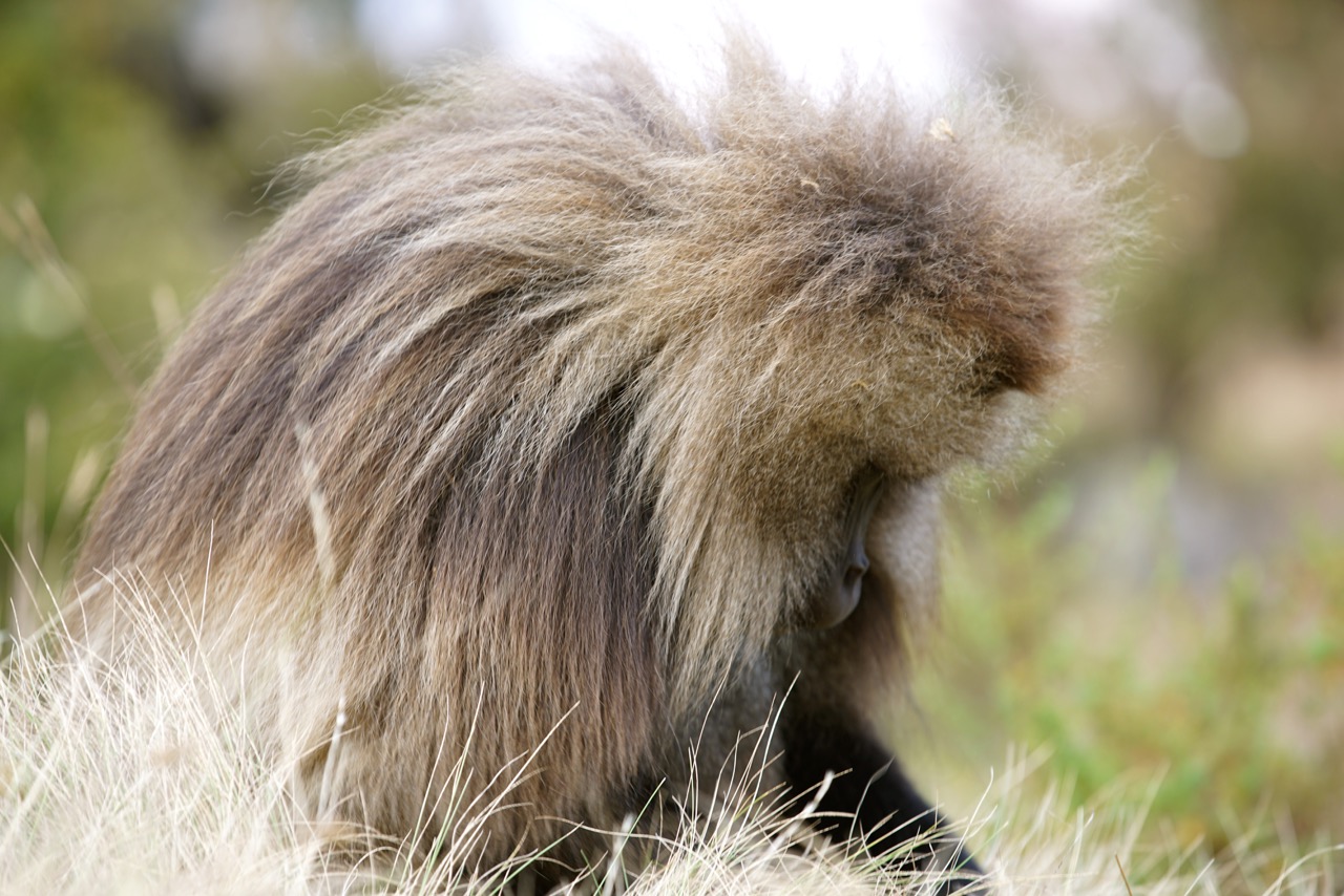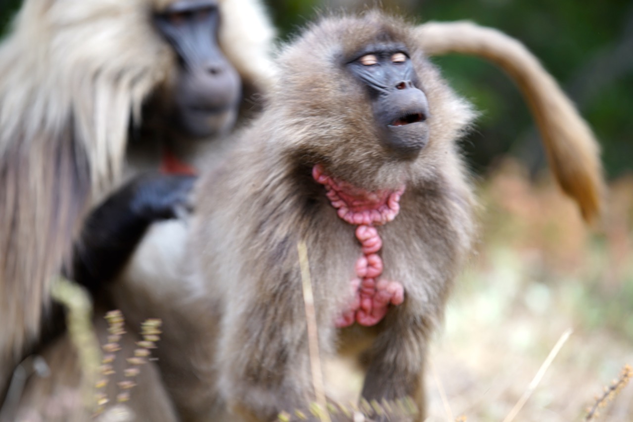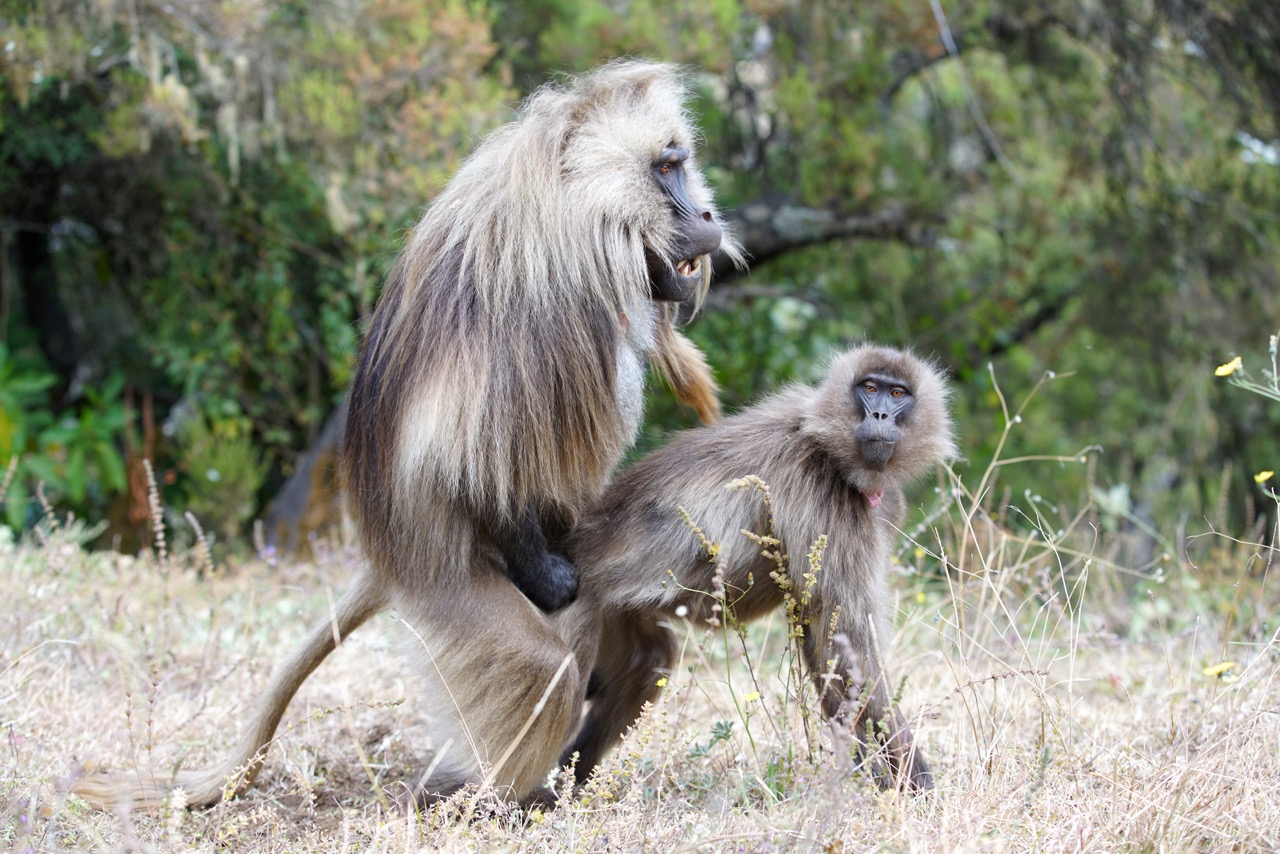 Geladas live in a complex multilevel society and they are the only primates that are primarily graminivores (grass eaters), grass blades make up to 90% of their diet. Reproduction and parenting is a big thing in the life of baboons and a female will copulate up to five times per day! When in estrus, the female points her posterior towards a male and raises it, moving her tail to one side. The male then approaches the female and inspects her chest and genital areas.