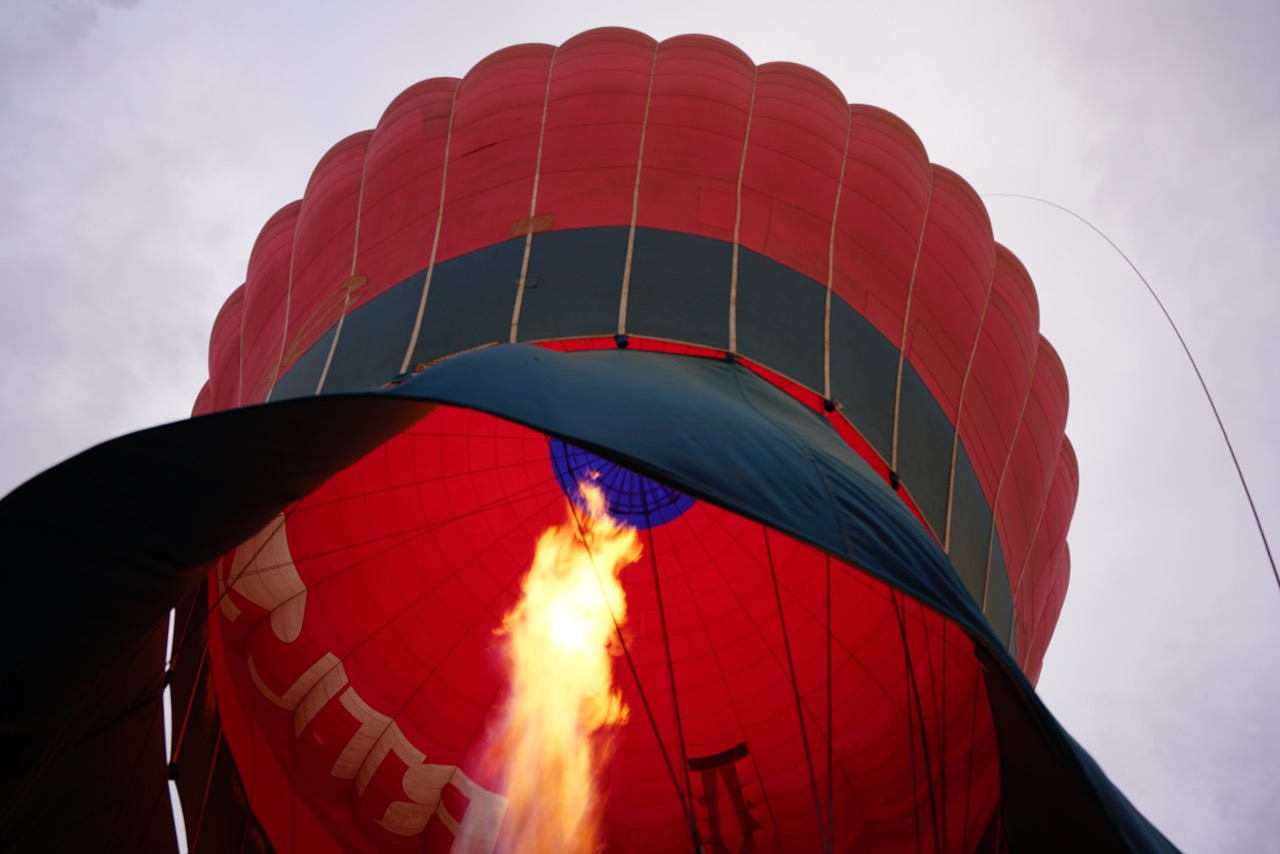 But now the balloon stands free and with each burst of propane gas, we get more and more amazed. Totally astonished of the balloons dimension we all jump in the huge basket which fits 20 people! We are just 10 so there is lots of space to move around while we get airborne and Michel burst for one more time gas in the balloon.