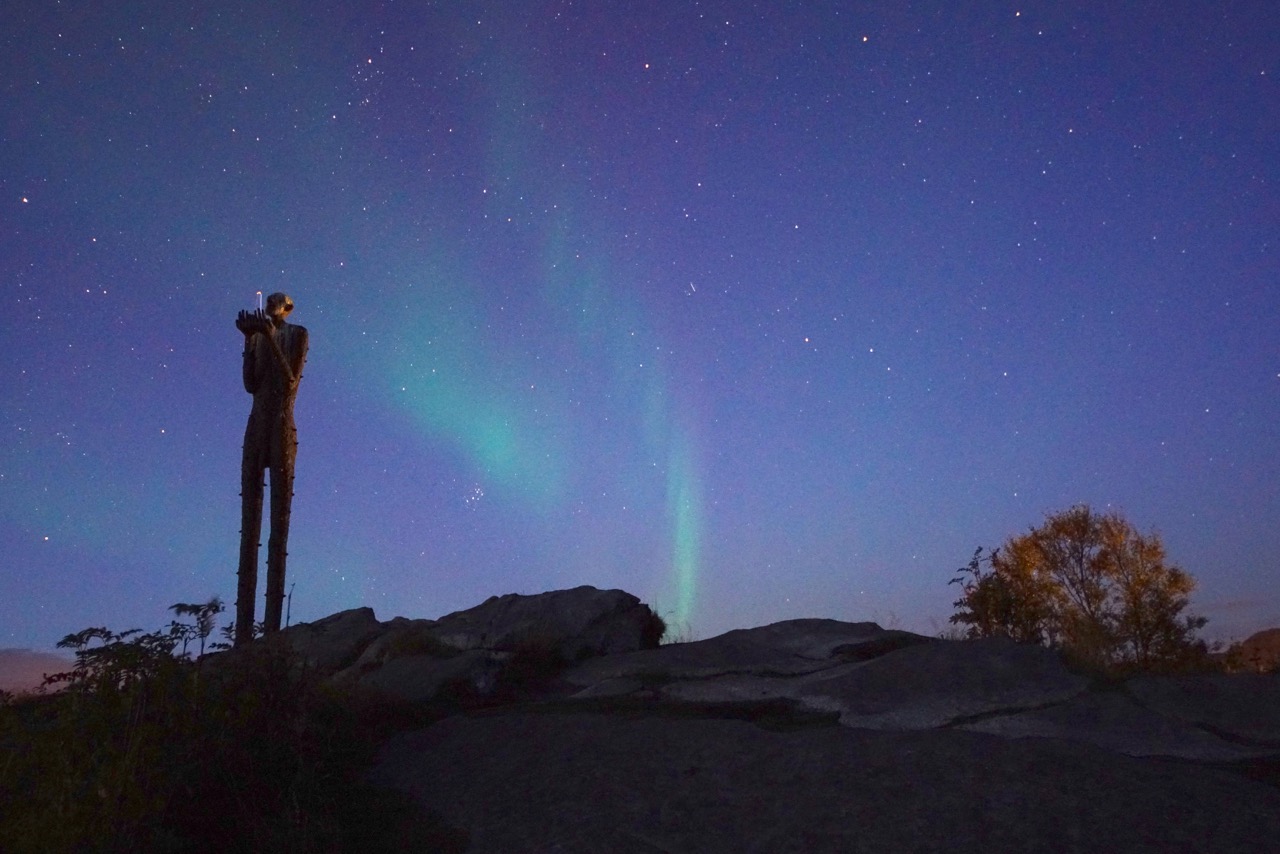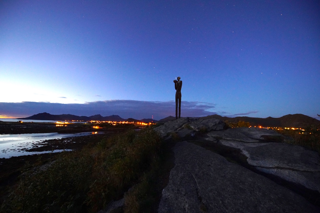 The Man from the sea is a 4.3-meter iron sculpture, a piece of art which can be seen at Vinje in Bø in Vesterålen. The sculpture holds a crystal in its hands, an offering to the sea which color changes blueish with the winter lights. For staying overnight we found the Skagakai guest house, a real old and former traditional trading house which was just five driving minutes away from the sculpture.
