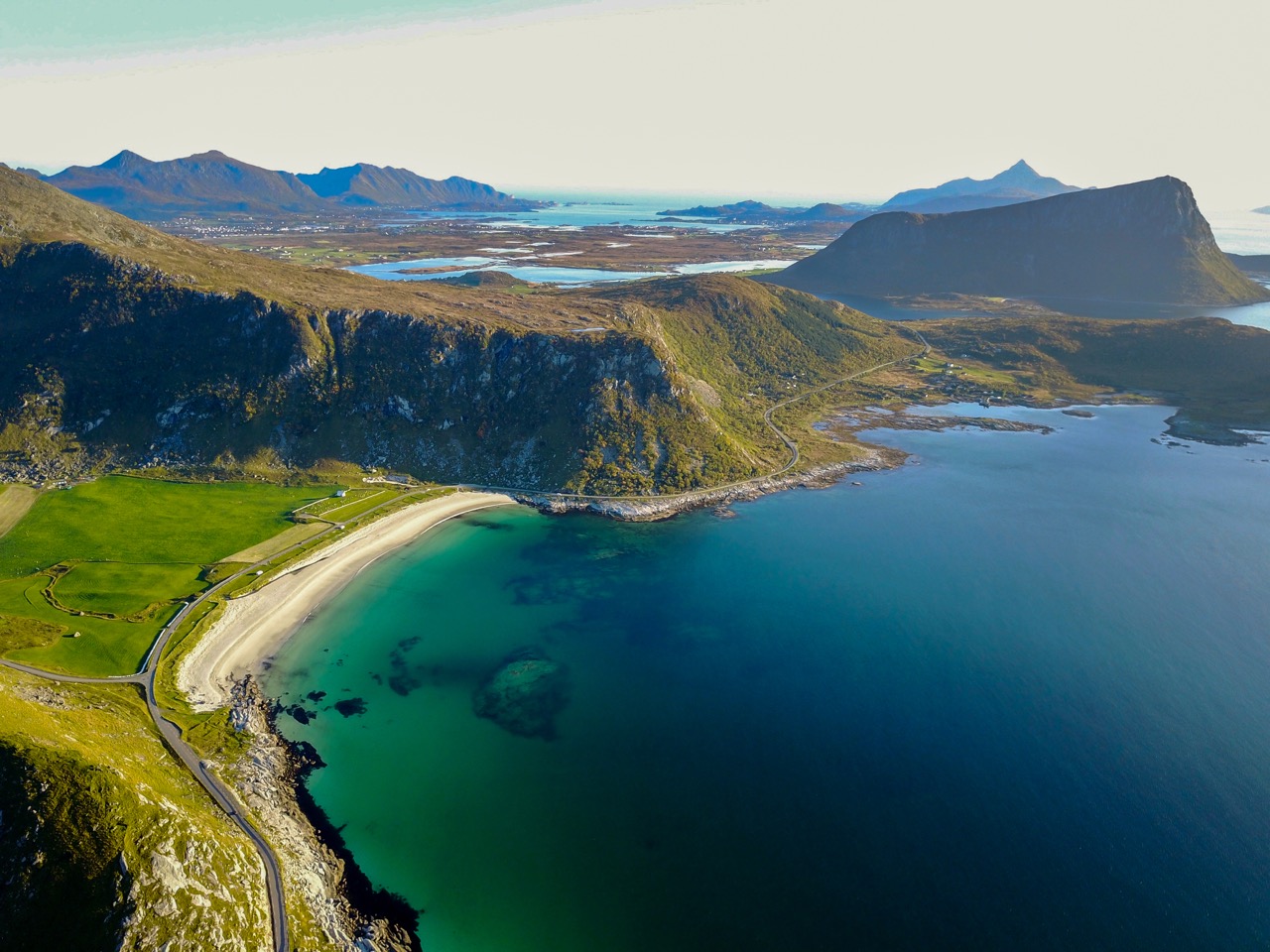 Haukland Beach with its white sand is spectacular and the colors of the ocean shimmer in all kinds of blueish and greenish facets. If you follow the road for a short drive towards the mountain you will find a hiking pass (on the left) which leads up to the summit, the view will take you by surprise. Calculate around 30 to 40 min. to reach the peak.