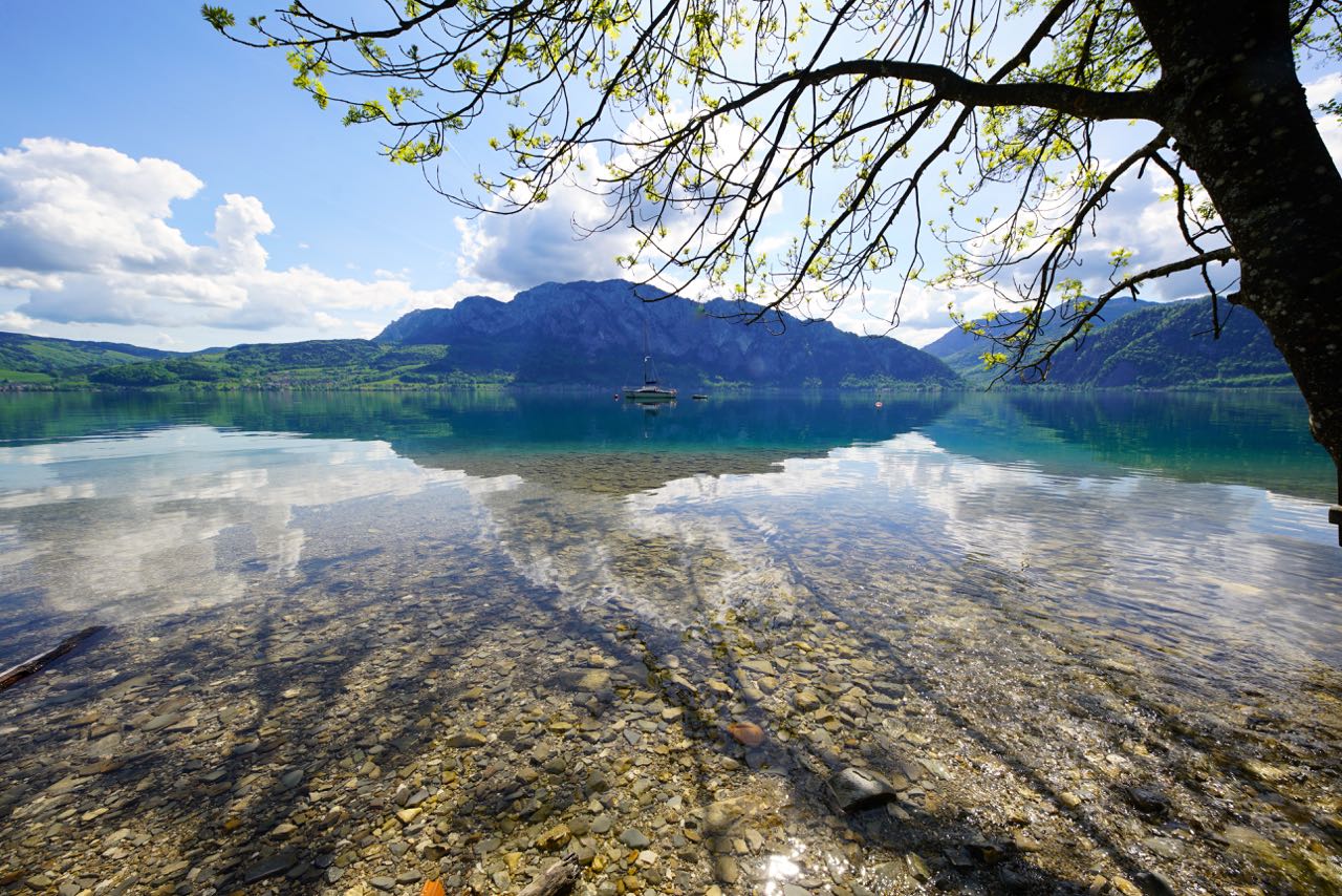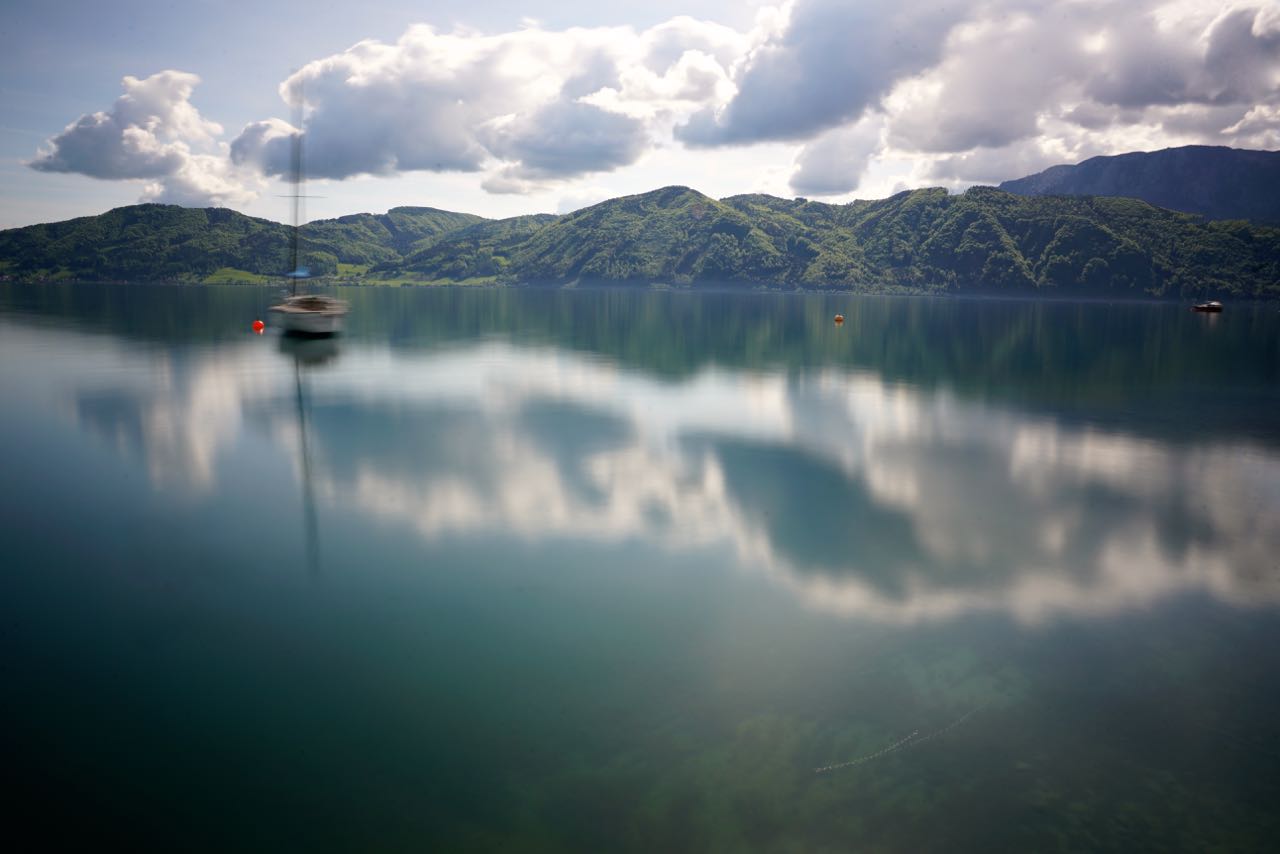 Some summers can be quiet cold and rainy here…, but not this year! So far (and we have mid-July right now) we had, except for a few rainy days, a beautiful and perfect summer with great weather conditions. I had to use the few rainy days and nights to keep up with writing my blog posts because during the days the weather was too tempting to resist the sporting activities. But not just the mountains were so attracting, the lake itself with its purity (as well as its drinking quality water) had such a strong appeal which made it hard not to spend lots of hours at its shore. No matter if you go there for swimming, sailing, reading a book, diving or to waterski… it always was a blessing and refreshing pleasure at various levels. The joy and awareness of being able to ‘use’ the lake at any time enthuses me daily. Some evenings were so quiet, calm and appealing that I went for a swim, even at midnight! Lean back now and enjoy some Attersee impressions: